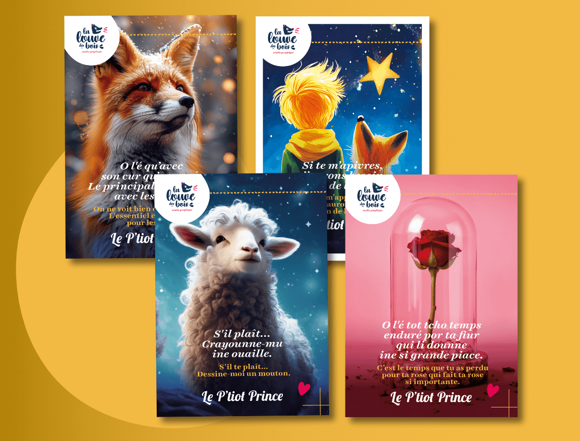 Lot de 4 cartes postales illustrées de citations célèbres issues du livre « Le Petit Prince » et traduites en patois de Vendée.