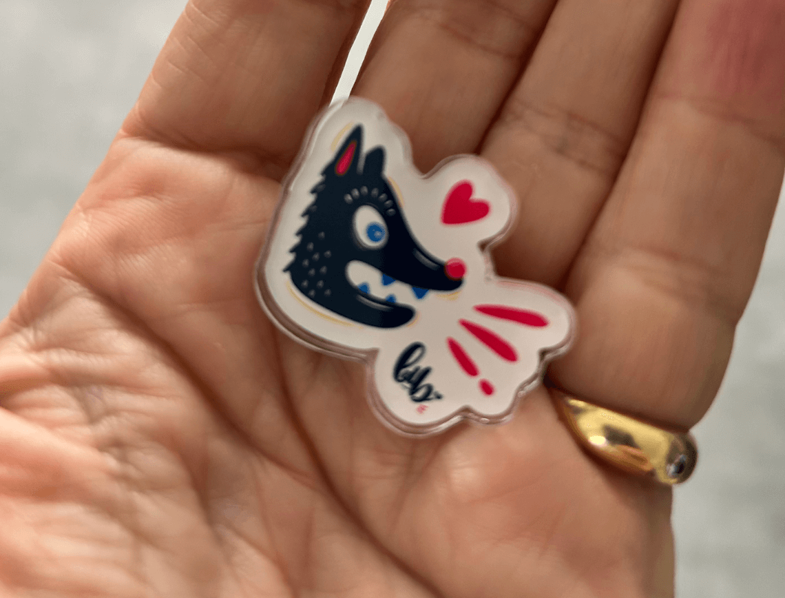 Une petite tête de louve qui a plein de choses à dire avec le cœur ! À porter fièrement au revers de son blouson…