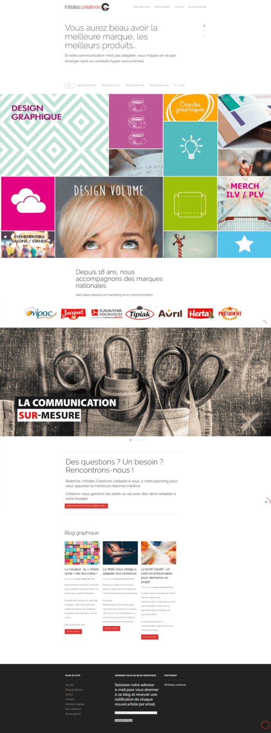 Créer une version moderne entièrement relookée du site Initiales créatives, agence de communication qui accompagne ses clients dans leurs projets de communication / marketing, pour présenter l’essentiel des prestations sur la page d’accueil avec un portfolio filtrable, dans une ambiance, simple, sobre et moderne.