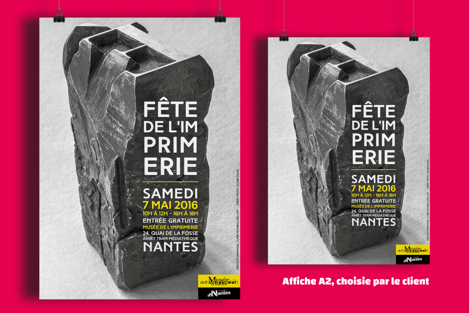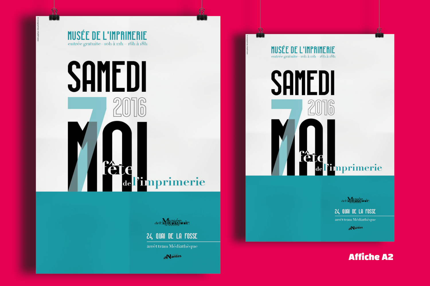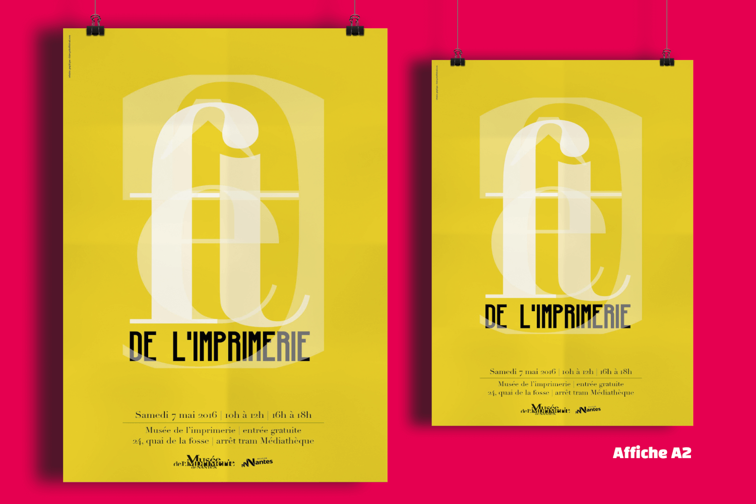 Créer une affiche, un an après la création de la carte de vœux, pour annoncer la fête annuelle du musée de l’Imprimerie de Nantes, pour mettre en avant le savoir faire de ce musée vivant, en valorisant aussi la culture et le patrimoine. Respecter les contraintes techniques : noir + une seule couleur. Choix de lier la technique numérique à la technique mécanique des caractère typographiques. Encres fluo et noire.