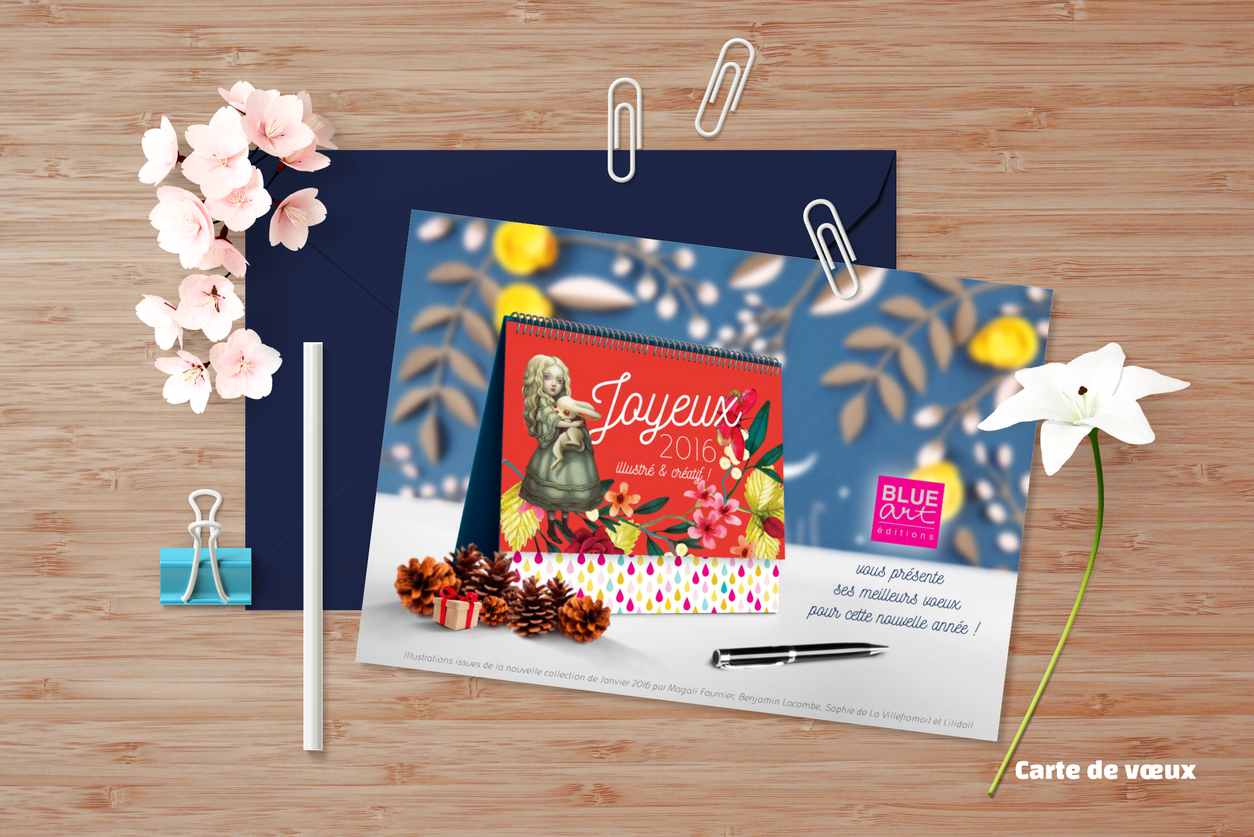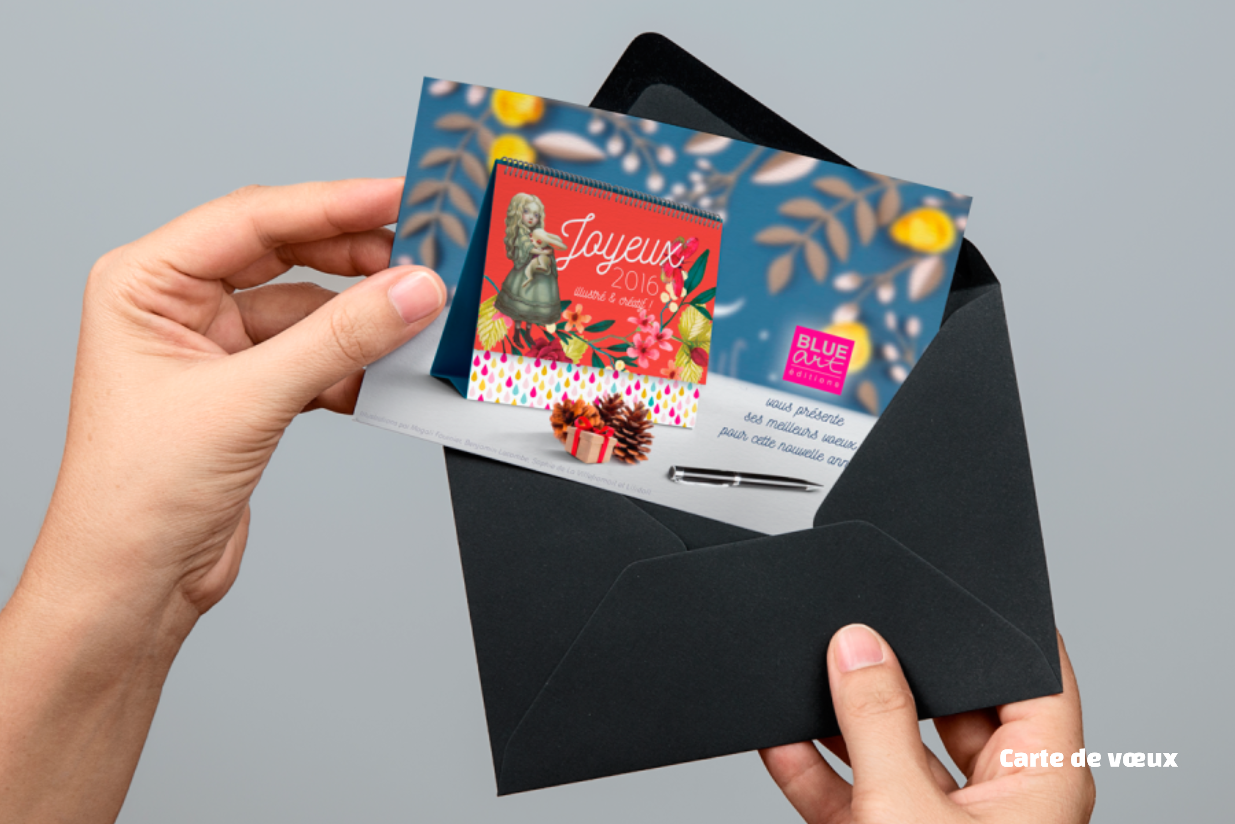 Créer une carte de vœux en mettant en scène, sous forme de papeterie, les quatre artistes édités dans la collection 2016.