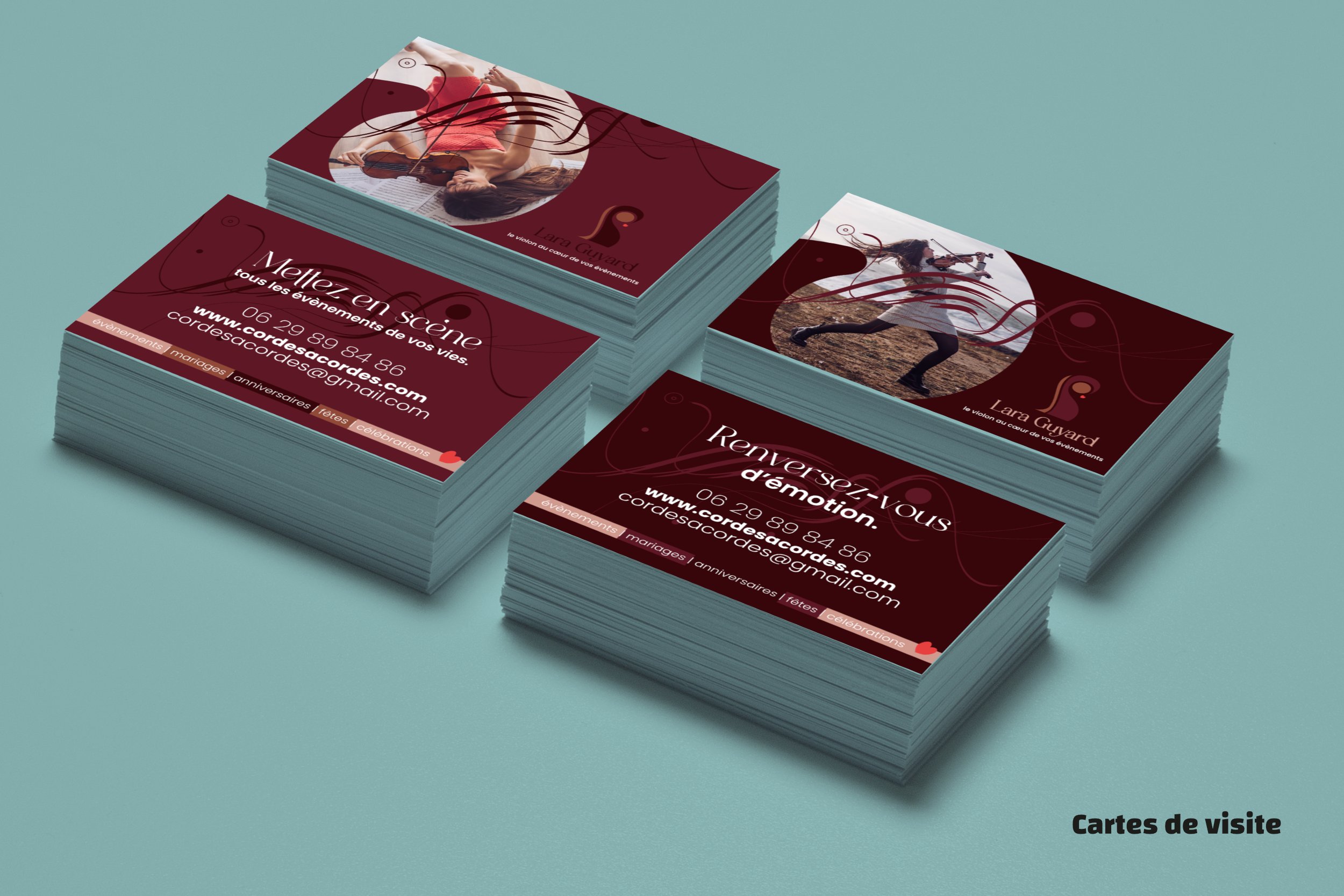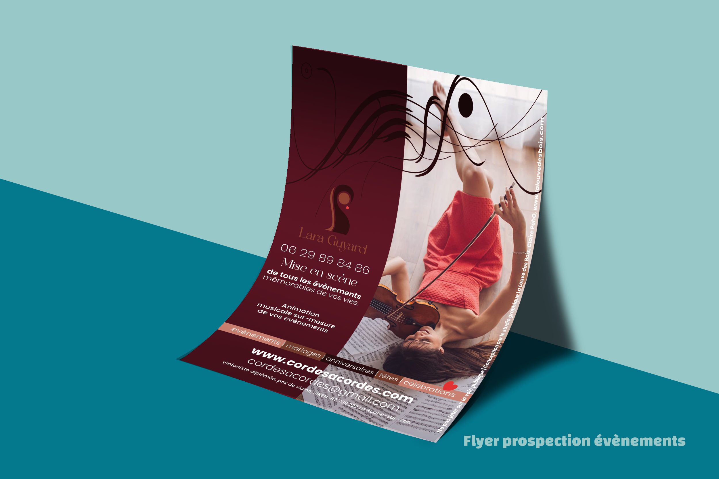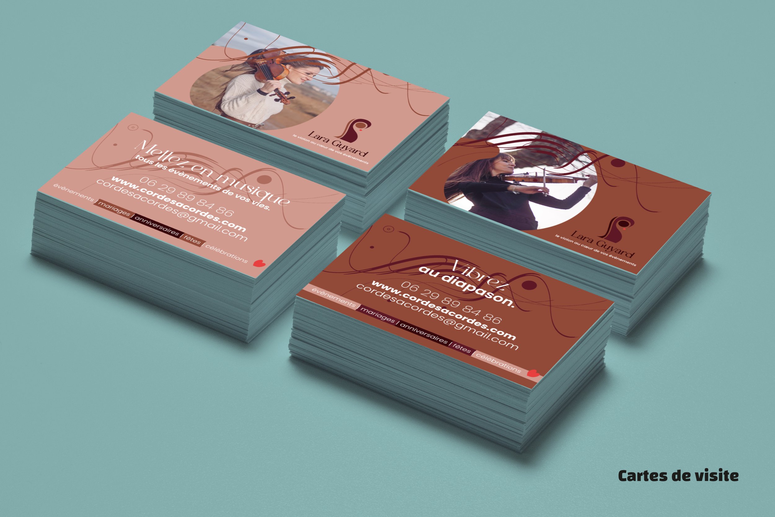 Créer un logotype et sa charte pour professionnaliser Lara Guyard qui lance son activité de violoniste évènementiel. Appliquer aux cartes de visite en 5 versions, à deux flyers de prospection et aux réseaux sociaux.