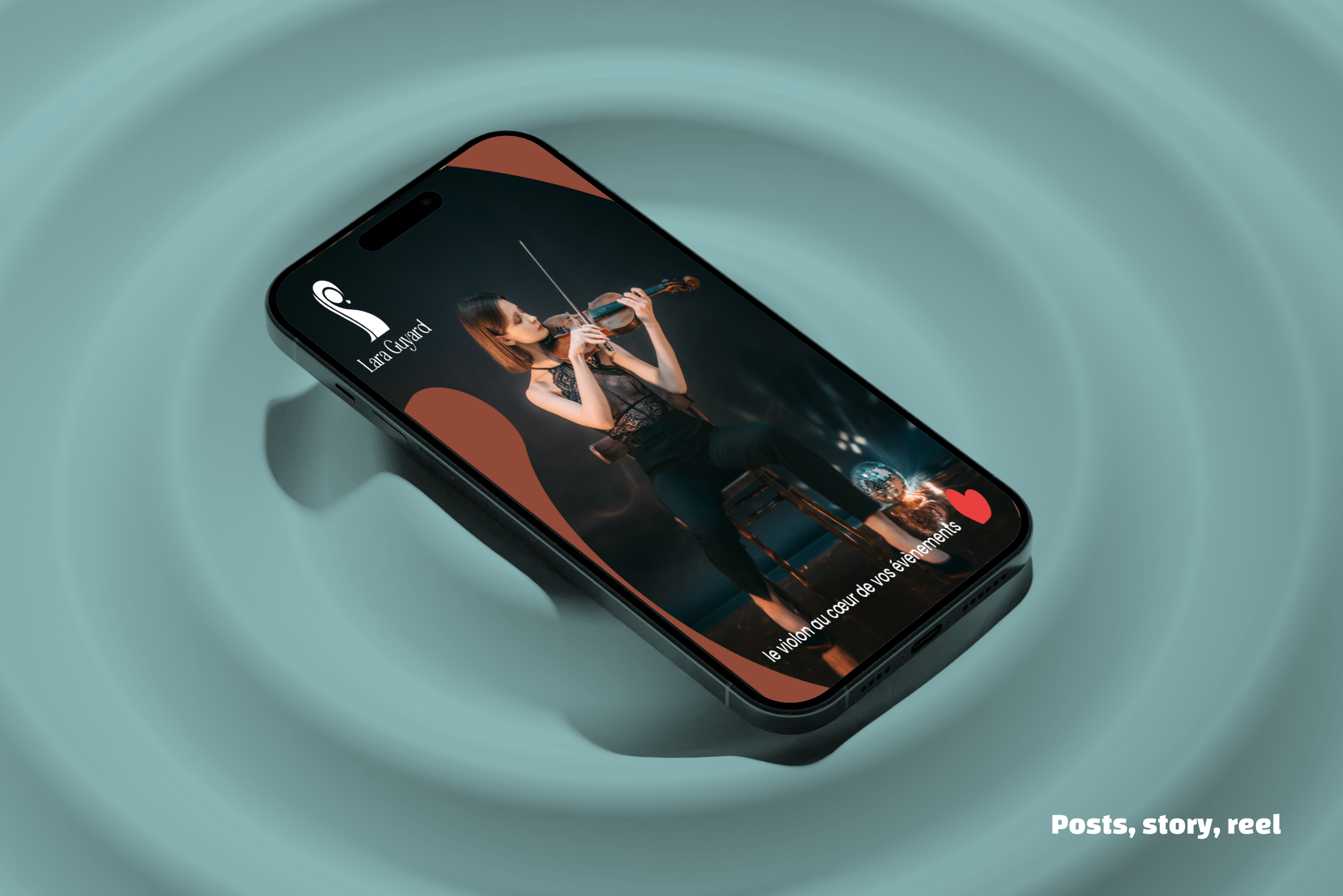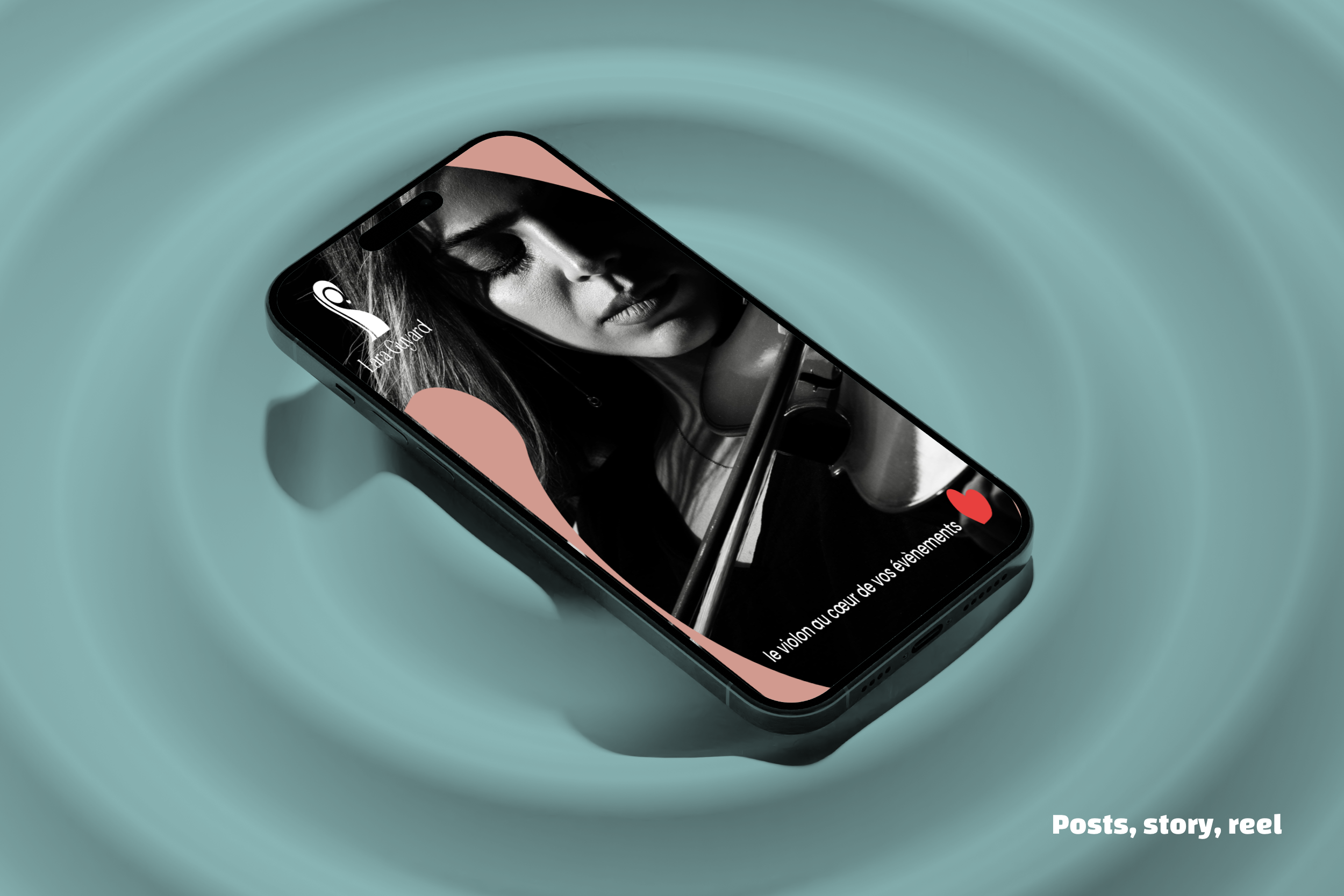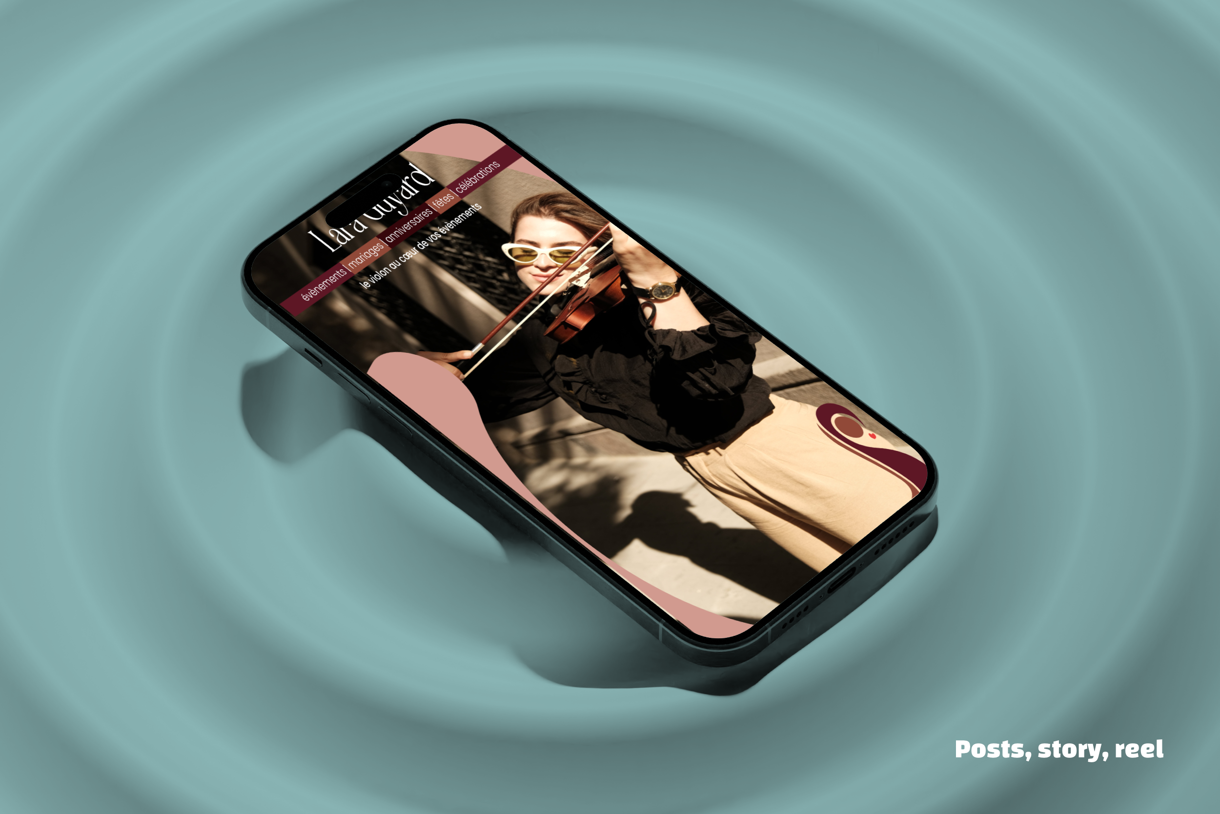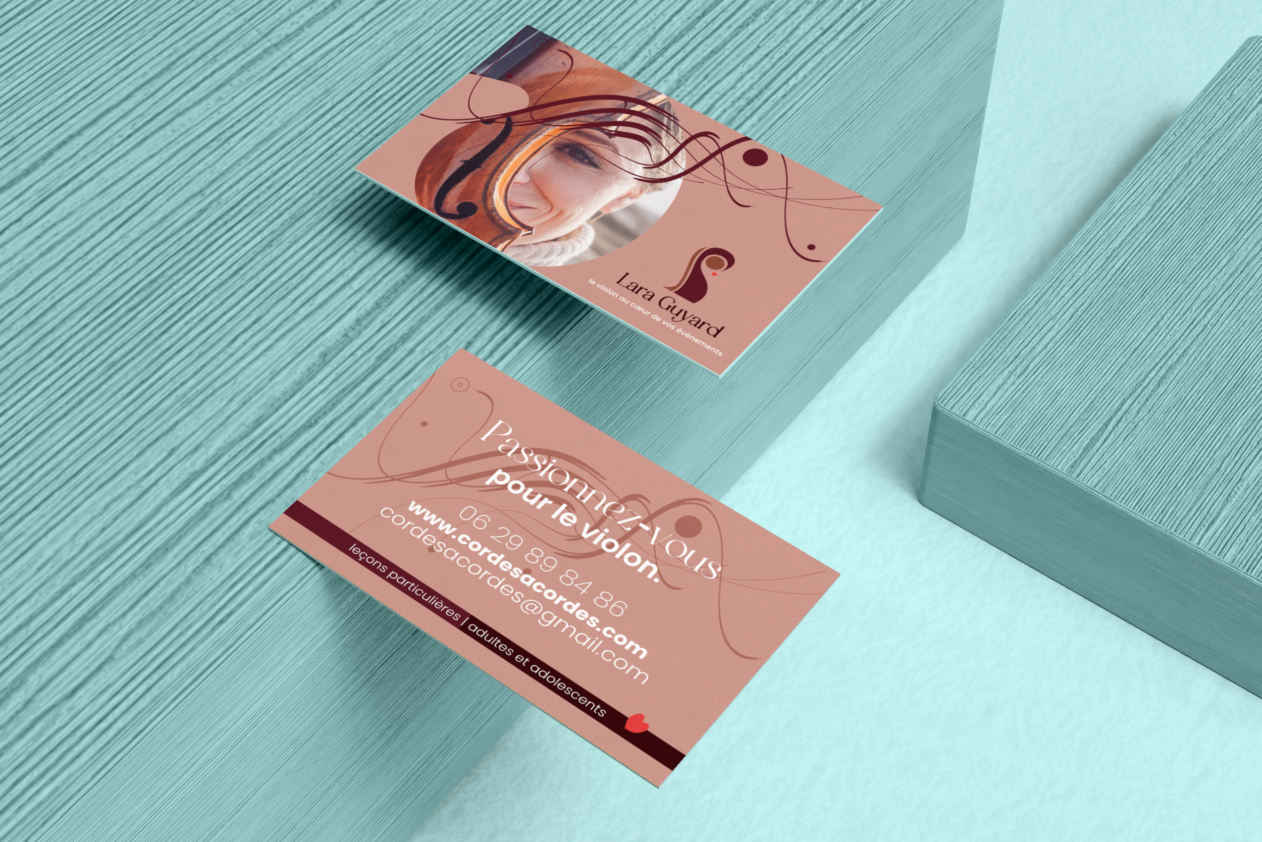 Créer un logotype et sa charte pour professionnaliser Lara Guyard qui lance son activité de violoniste évènementiel. Appliquer aux cartes de visite en 5 versions, à deux flyers de prospection et aux réseaux sociaux.