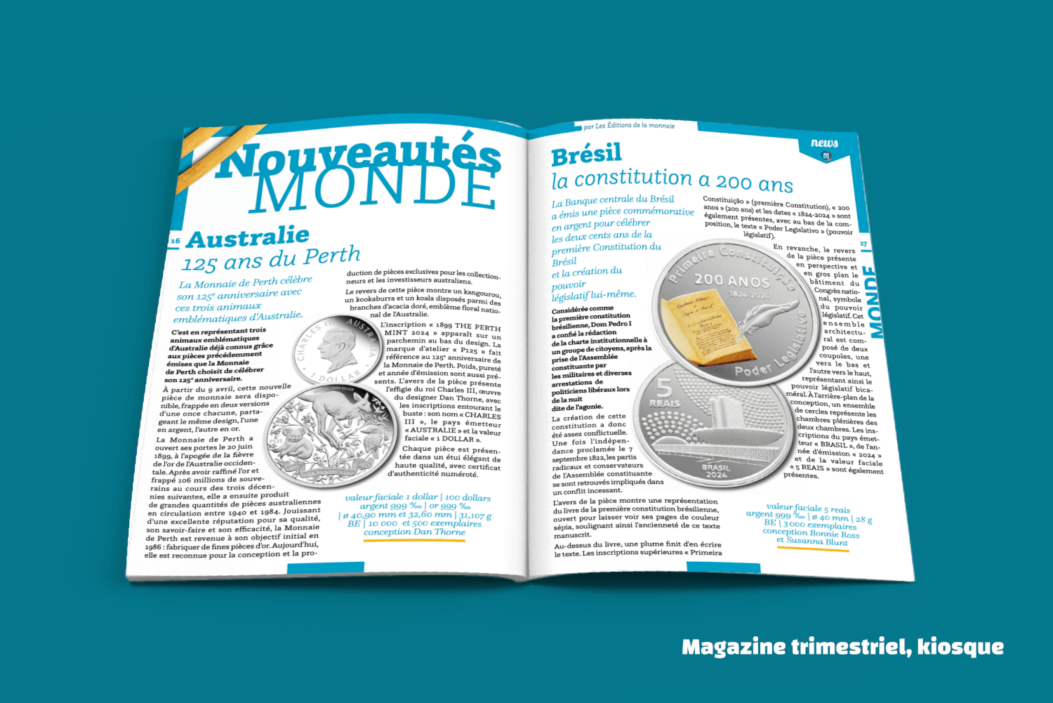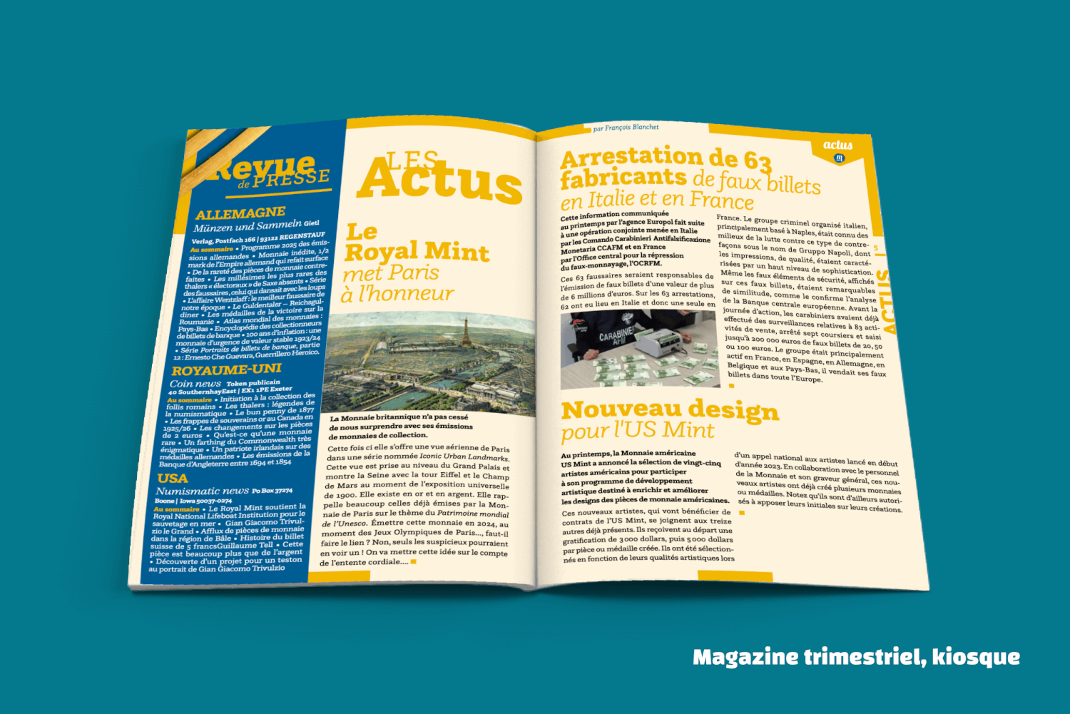 Créer une maquette de magazine spécialisé en numismatique internationale, à destination des collectionneurs et amateurs de culture et histoire numismatique. Cohérence avec son autre magazine Argus euros et Monnaie magazine qu’il a remplacé à partir de début 2024.