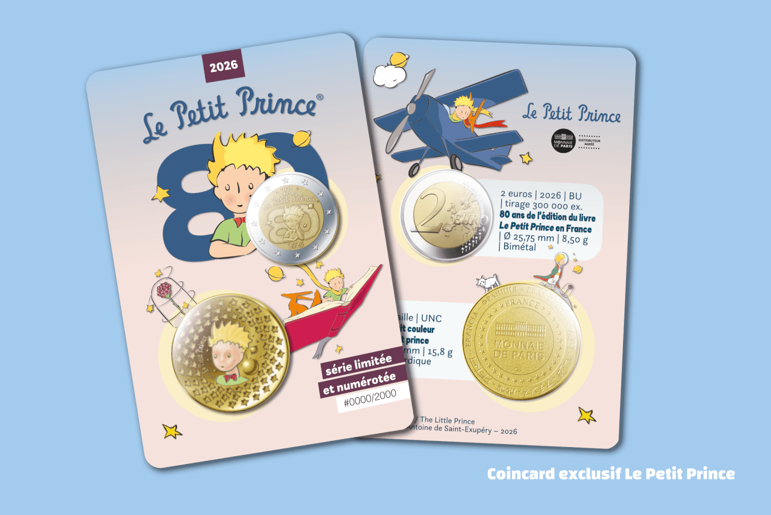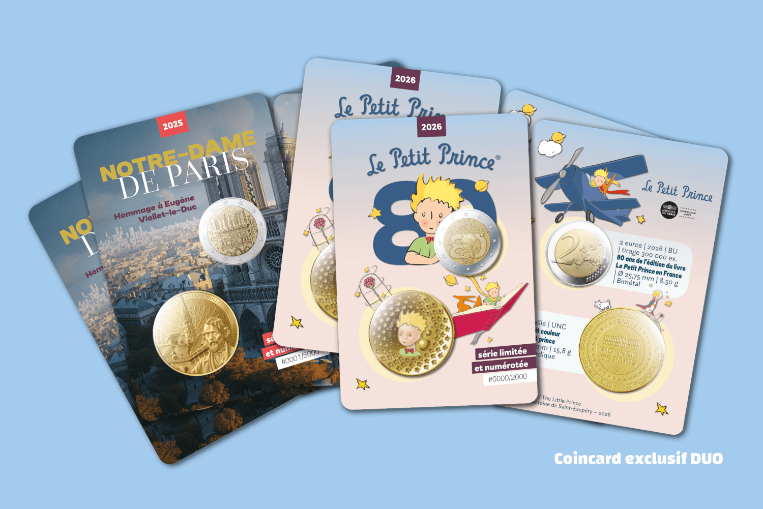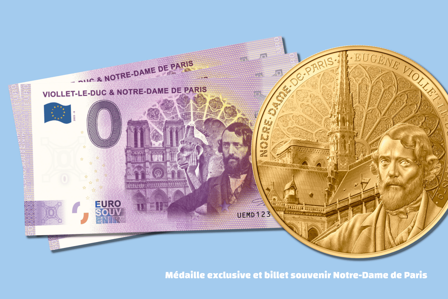 Deux premiers thèmes : Notre-Dame de Paris avec un billet touristique en hommage à Eugène Viollet-Le-Duc, et Le Petit Prince.