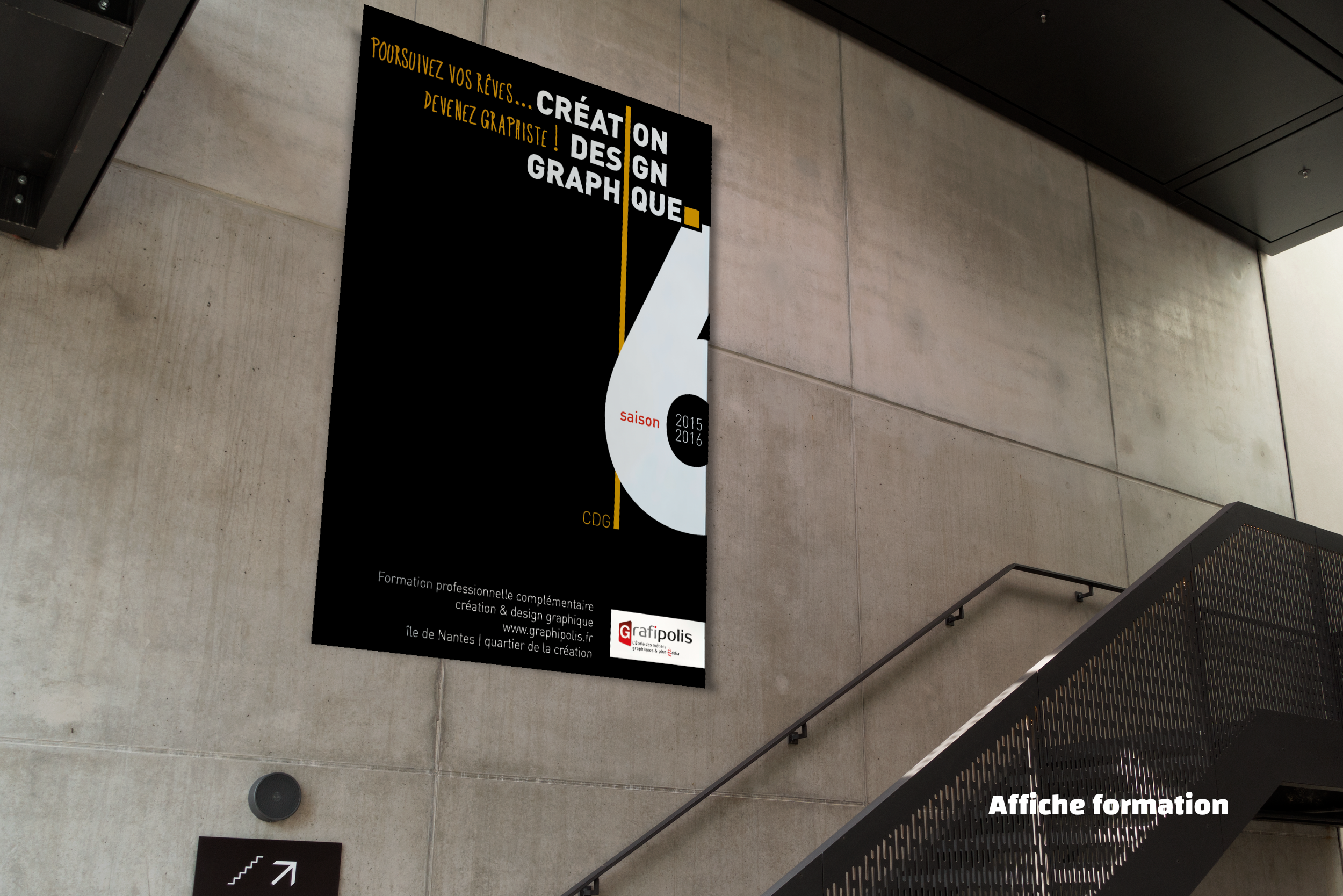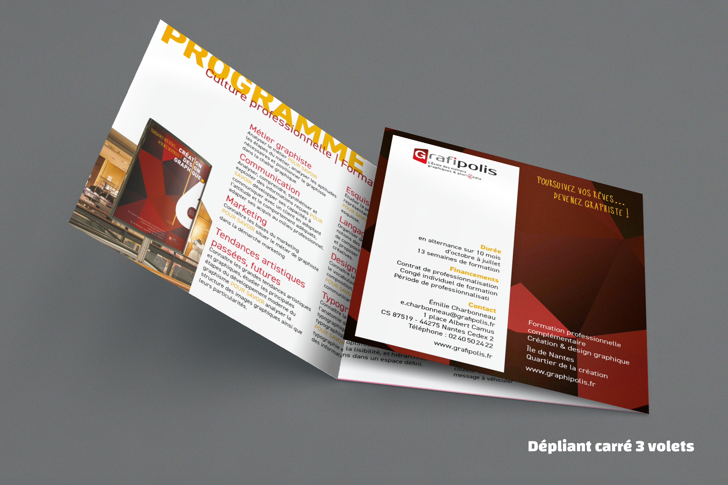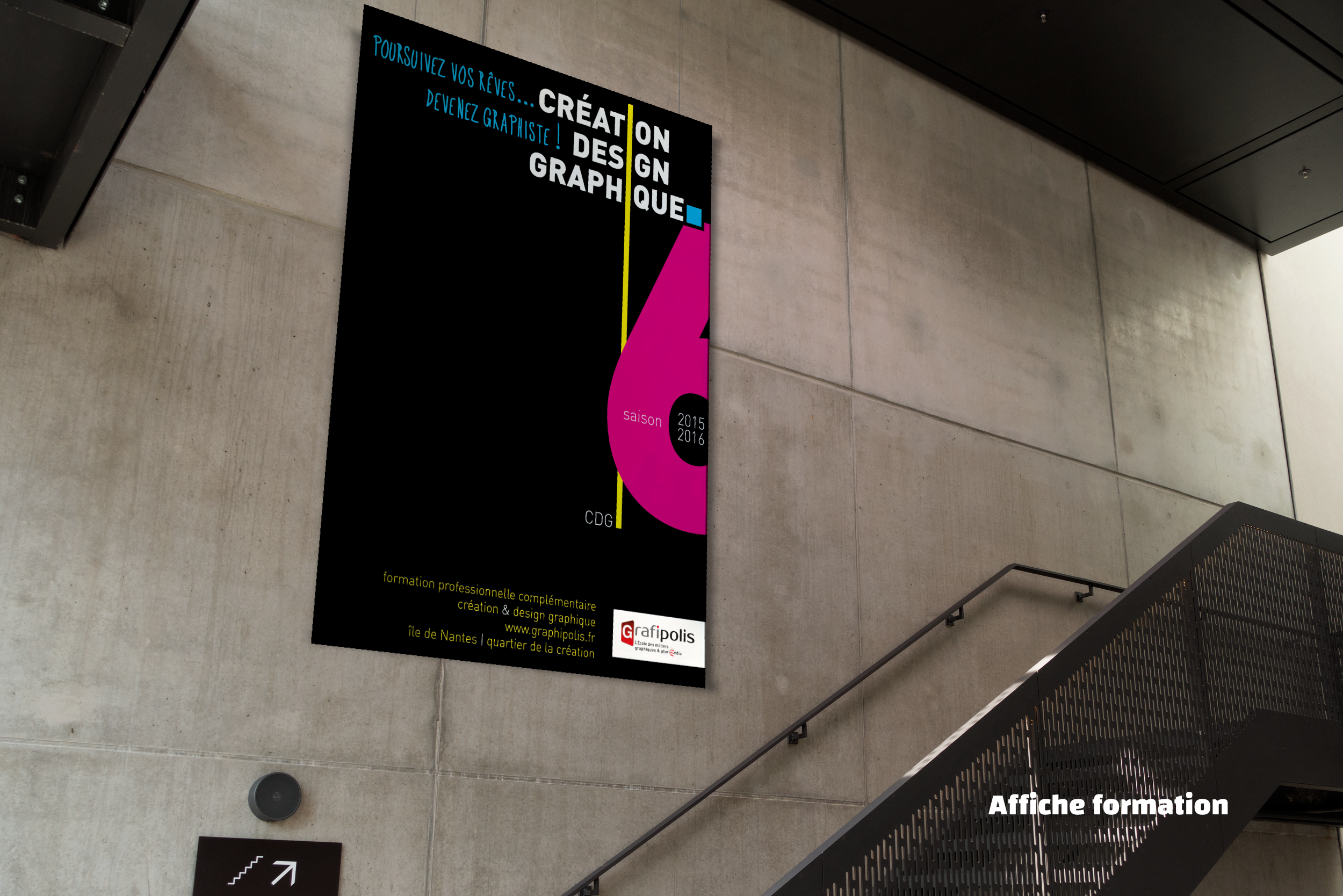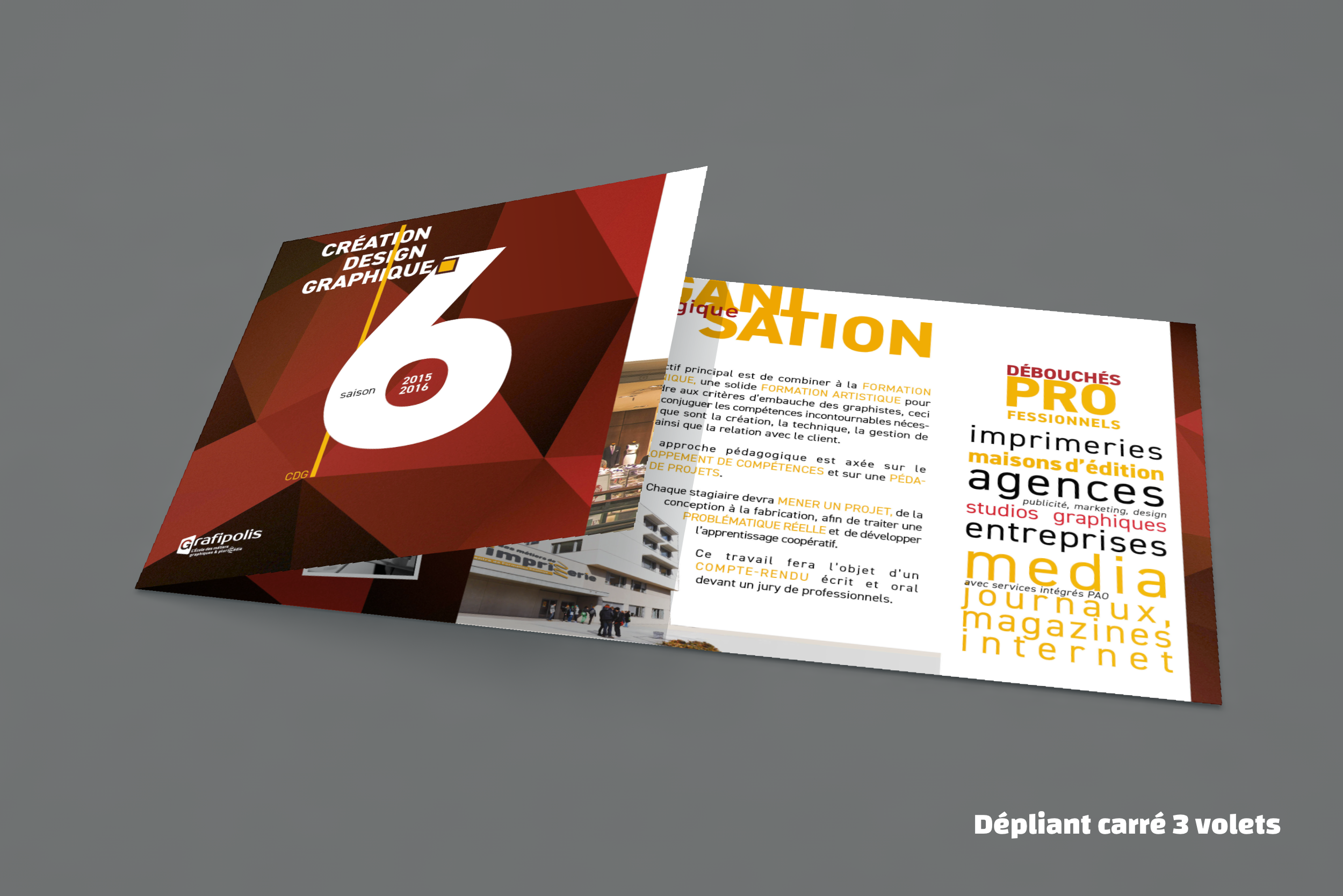 Créer une affiche selon la nouvelle charte de Grafipolis pour inviter à s’inscrire à la formation de graphiste. Décliner en un dépliant à distribuer qui sera imprimé par les élèves de la formation Conducteur Offset. Trois versions de couleur proposées.