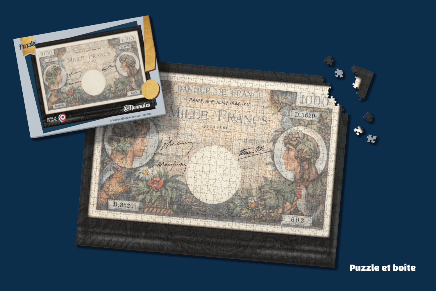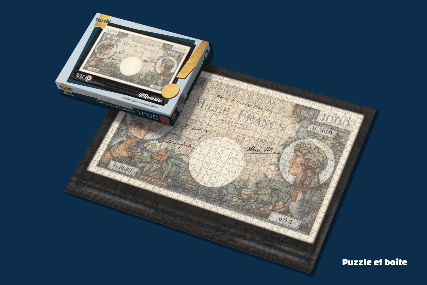 Créer un puzzle à partir d’un billet emblématique pour les collectionneurs numismates. Choisir un fabricant français et concevoir la boîte pour recevoir les 1000 pièces de ce puzzle.